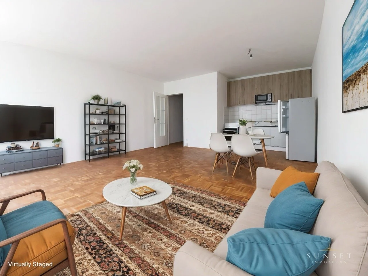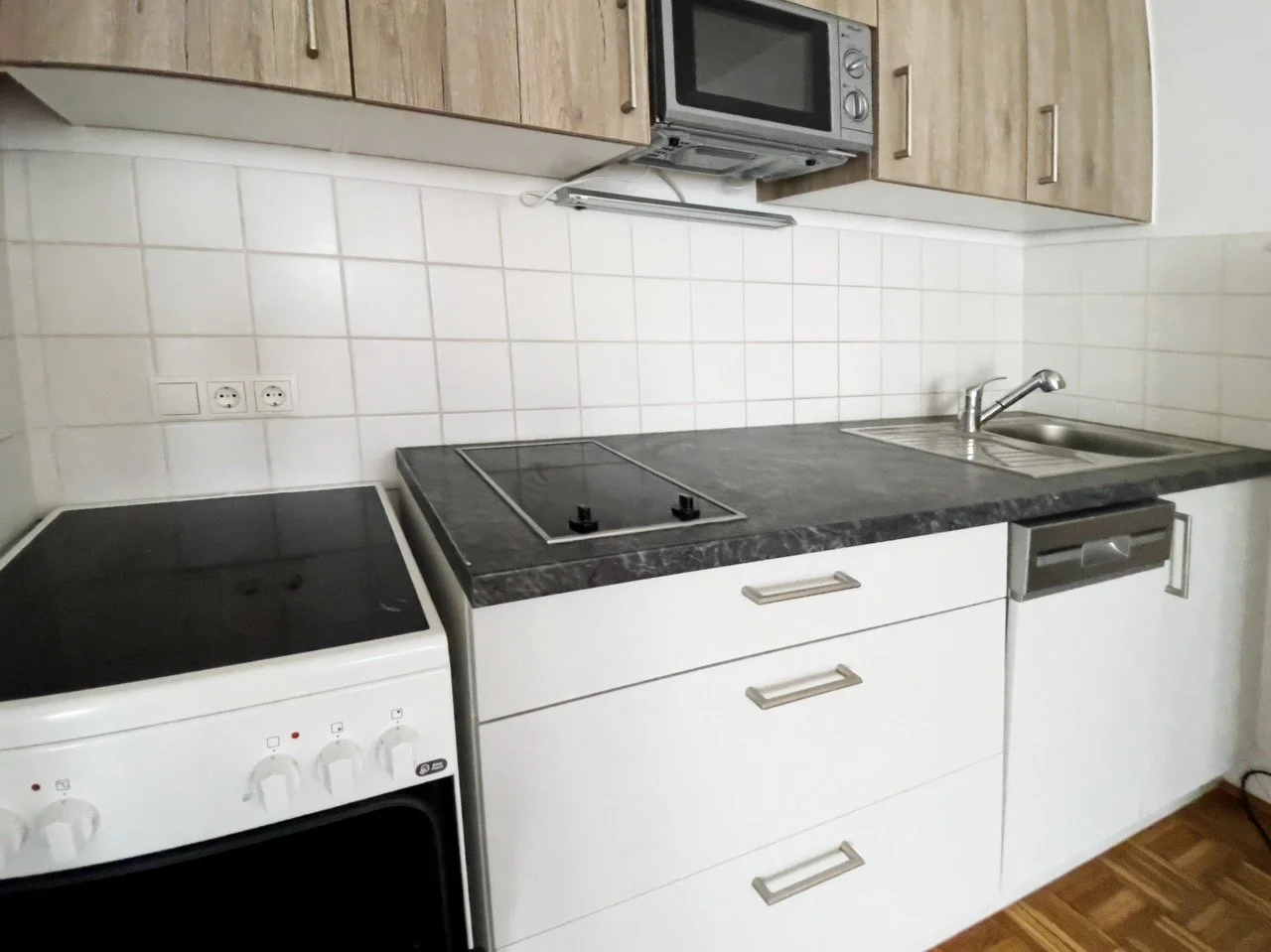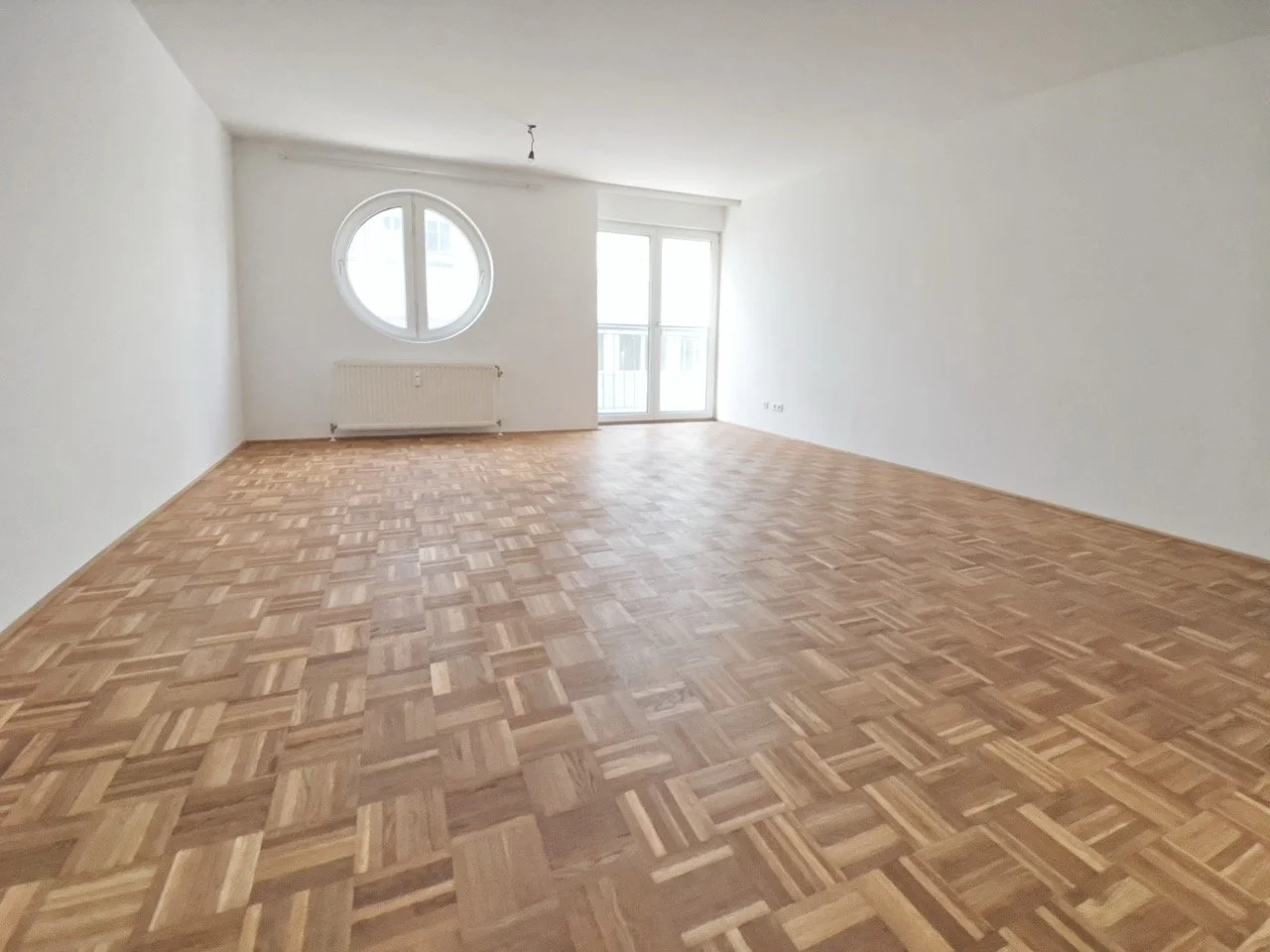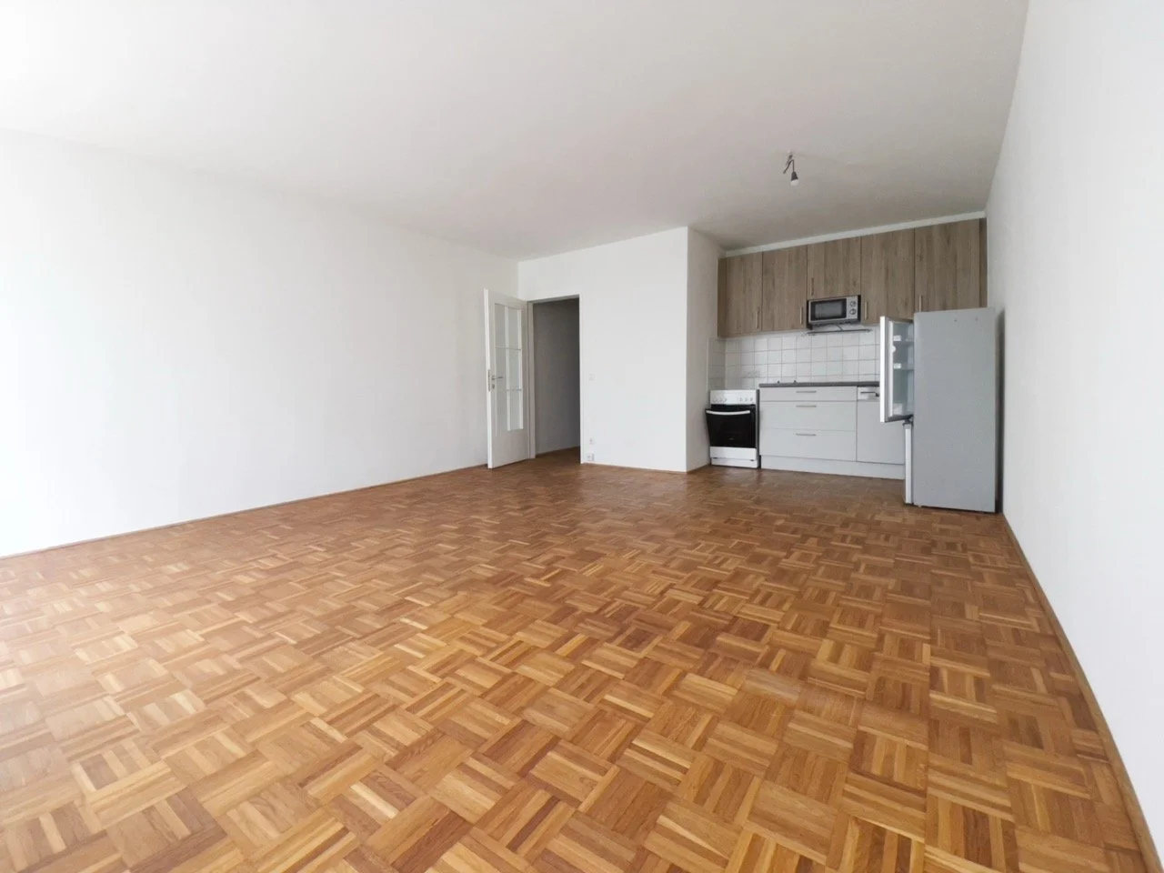 Central living/kitchen area (approx. 30 m²) with new real wood parquet flooring, fitted kitchen (stove, oven, microwave, fridge)